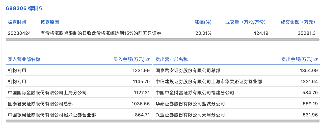 4月24日,德科立今日涨停,龙虎榜数据显示,上榜营业部席位全天成交9867.95万元,占当日总成交金额比例为28.13%。其中,买入金额为5506.37万元,卖出金额为4361.58万元,合计净买入1144.79万元。