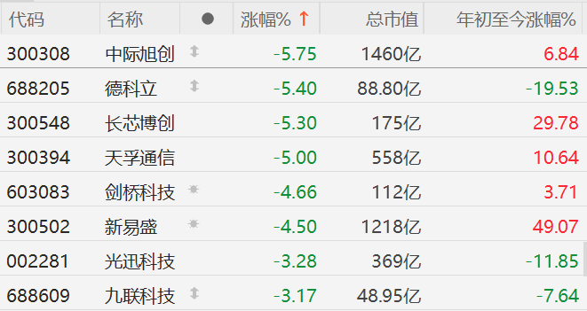 A股CPO概念股集体跳水,中际旭创、德科立、长芯博创、天孚通信跌超5%,新易盛跌超4%,九联科技跌超3%