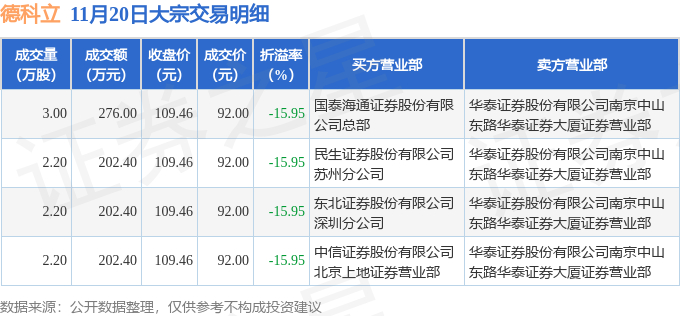 11月20日德科立现4笔折价15.95%的大宗交易 合计成交883.2万元