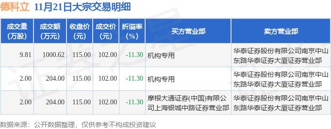 11月21日德科立现3笔折价11.3%的大宗交易 合计成交1408.62万元