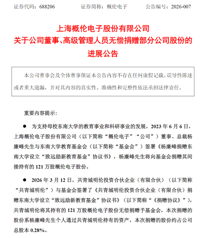 3月15日晚间,概伦电子(688206)发布公告称,2026年3月12日,共青城明伦投资合伙企业(有限合伙)(以下简称“共青城明伦”)与东南大学教育基金会签署了《共青城明伦投资合伙企业(有限合伙)捐赠东南大学设立“致远励新教育基金”协议书》,共青城明伦将其持有的121万股概伦电子股份无偿捐赠予基金会。本次捐赠的股份系杨廉峰通过共青城明伦持有的资产,约占公司总股本的0.28%。