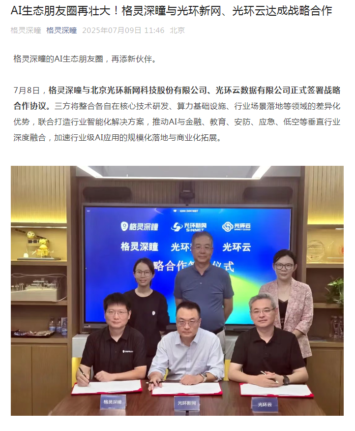 每经AI快讯,7月8日,格灵深瞳与北京光环新网科技股份有限公司、光环云数据有限公司正式签署战略合作协议。三方将整合各自在核心技术研发、算力基础设施、行业场景落地等领域的差异化优势,联合打造行业智能化解决方案,推动AI与金融、教育、安防、应急、低空等垂直行业深度融合,加速行业级AI应用的规模化落地与商业化拓展。