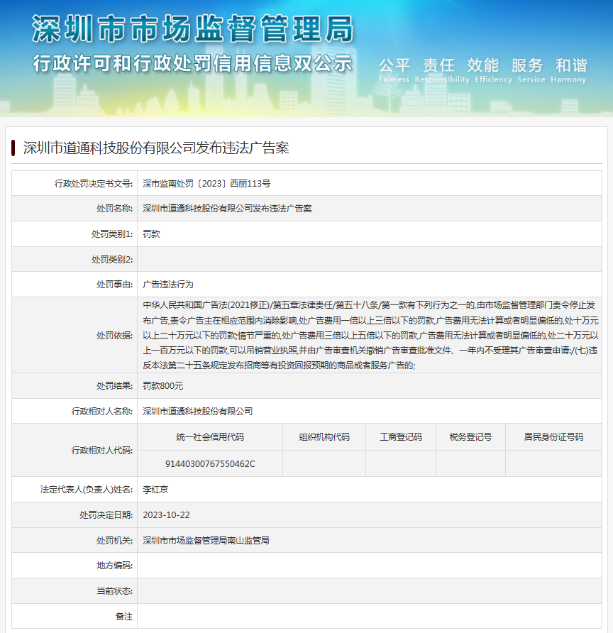 中国质量新闻网讯 近日,深圳市市场监督管理局南山监管局发布行政处罚信息(深市监南处罚〔2023〕西丽113号),涉及深圳市