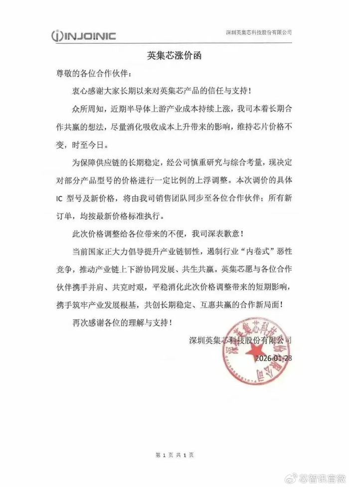 继国科微、中微半导相继宣布涨价之后,1月28日,国产芯片厂商深圳英集芯科技股份有限公司(以下简称“英集芯”)也发布了涨价函,宣布对旗下部分产品进行涨价,但具体涨幅并未公布。