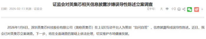 红星资本局2月14日消息,据证监会网站2月13日消息,2026年1月6日,深圳英集芯科技股份有限公司(简称“英集芯”,证券简称:688209)在上证E互动平台人为策划“自问自答”,信息披露构成误导性陈述。