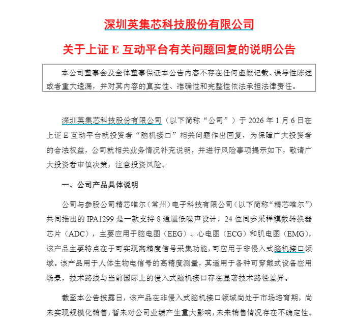 1月7日一早,英集芯发布关于上证E互动平台有关问题回复的说明公告。英集芯承认,公司的IPA1299芯片产品为与参股公司精芯唯尔(常州)电子科技有限公司共同推出,该产品尚处市场培育期,尚未实现规模化销售,暂未对公司业绩产生重大影响,未来销售情况存在不确定性,其应用于非侵入式脑机接口领域,与当前国际上的侵入式脑机接口存在显著技术路径差异。