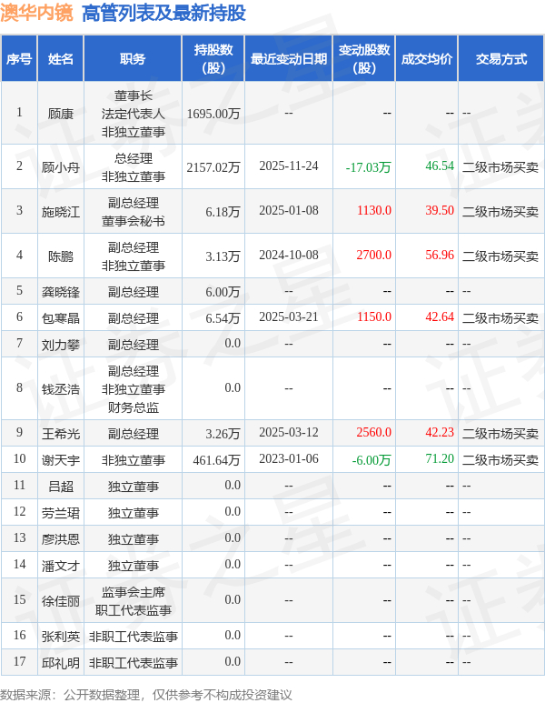 澳华内镜近半年内的董监高及核心技术人员增减持详情如下: