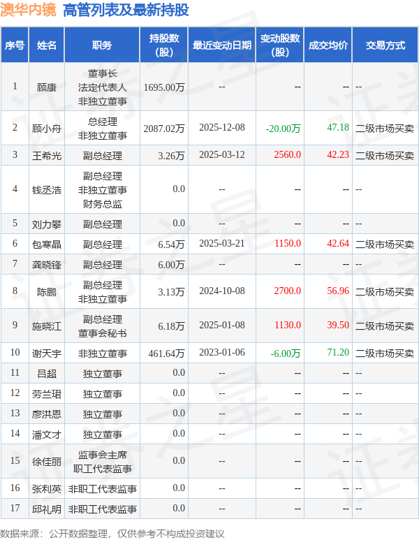 澳华内镜近半年内的董监高及核心技术人员增减持详情如下: