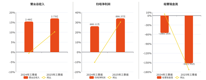 公司营业总收入为2.73亿元。归母净利润为886.37万元。经营活动现金净流入为-5411.45万元,较去年同报告期经营活动现金净流入减少3426.26万元。