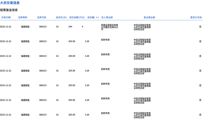 12月22日,瑞晟智能大宗交易成交23.68万股,成交额1444.48万元,占当日总成交额的27.97%,成交价61元,较市场收盘价71.19元折价14.31%。