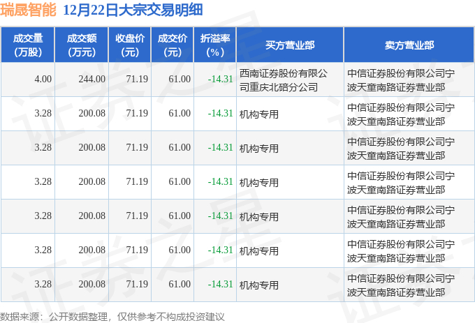 12月22日瑞晟智能现7笔折价14.31%的大宗交易 合计成交1444.48万元