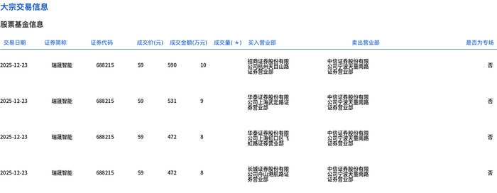 12月23日,瑞晟智能大宗交易成交55万股,成交额3245万元,占当日总成交额的30.81%,成交价59元,较市场收盘价73.36元折价19.57%。