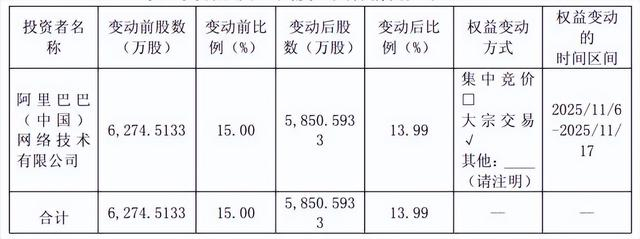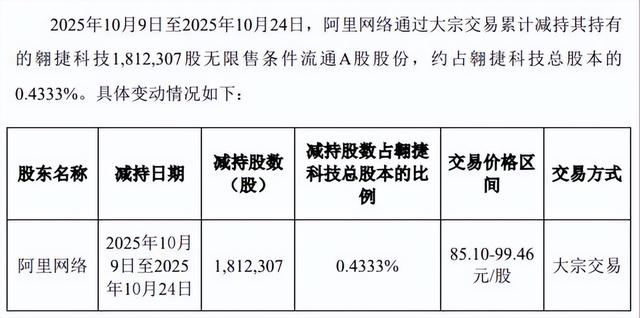 阿里网络的减持并非“一次性动作”,而是呈现明显的阶段性节奏。据翱捷科技公告,2025年10月9日至10月24日,阿里通过大宗交易减持181.23万股,占公司总股本0.4333%;11月6日至17日,再减持423.92万股,占比从15%降至13.99%;11月24日至12月1日,通过集中竞价+大宗交易减持543.9万股,占比进一步降至12.69%。三次减持累计超1149万股,按期间最低价计算,套现规模超9.25亿元。