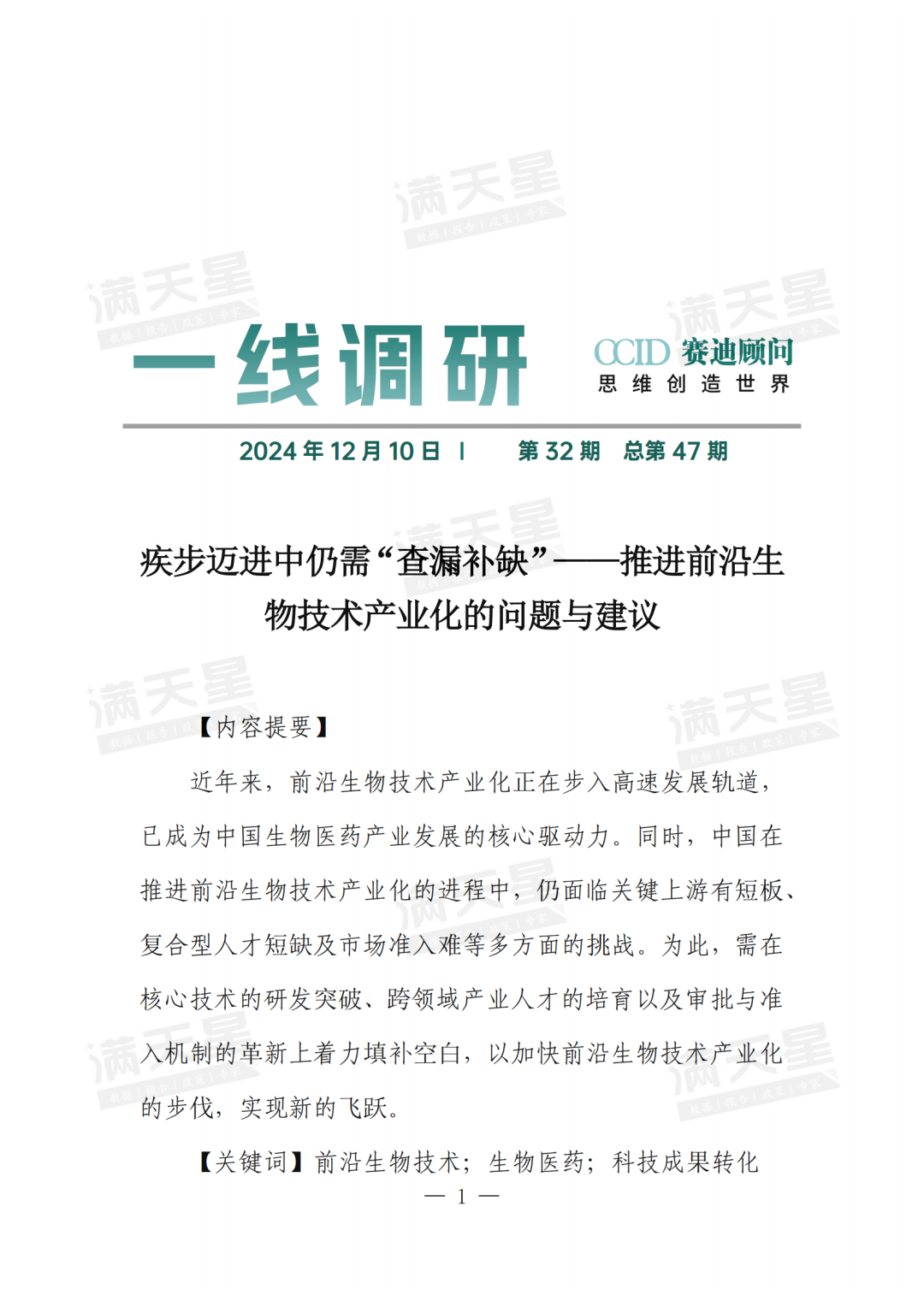 近年来,前沿生物技术产业化正在步入高速发展轨道,已成为中国生物医药产业发展的核心驱动力。同时,中国在推进前沿生物技术产业化的进程中,仍面临关键上游有短板、复合型人才短缺及市场准入难等多方面的挑战。为此,需在核心技术的研发突破、跨领域产业人才的培育以及审批与准入机制的革新上着力填补空白,以加快前沿生物技术产业化的步伐,实现新的飞跃。