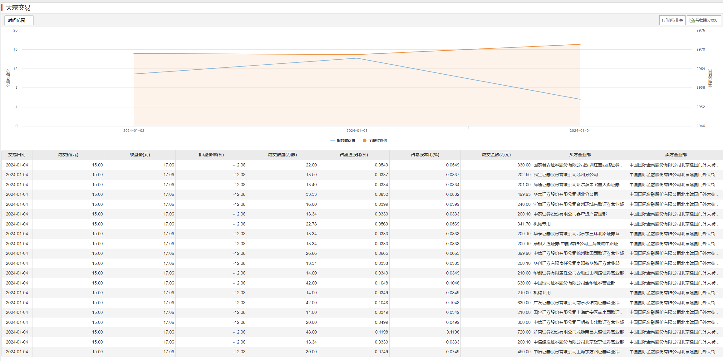 今日大宗交易成交438.37万股,成交额6575.55万元,占当日总成交额的16.1%,成交价15元,较市场收盘价折价12.08%。