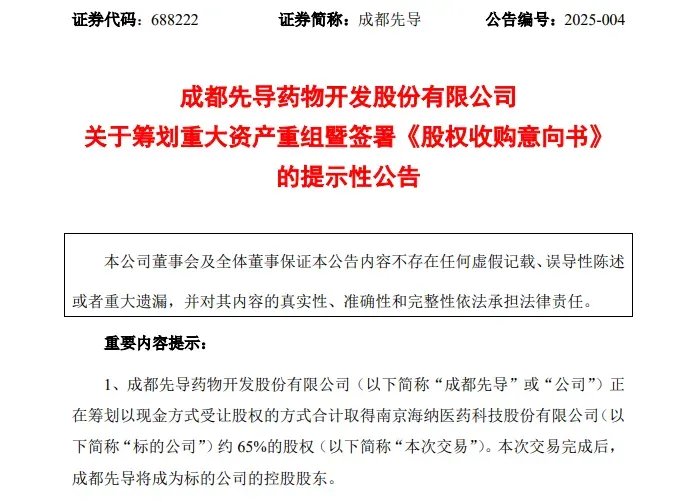3月31日晚间,成都先导发布公告称,公司正在筹划以现金方式受让股权的方式合计取得南京海纳医药科技股份有限公司(以下简称“海纳医药”)约65%的股权。本次交易完成后,成都先导将成为标的公司的控股股东。