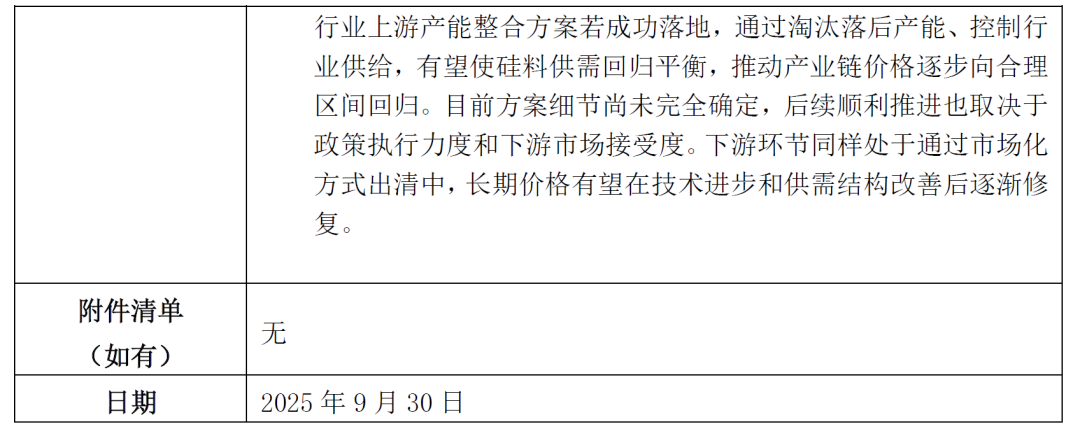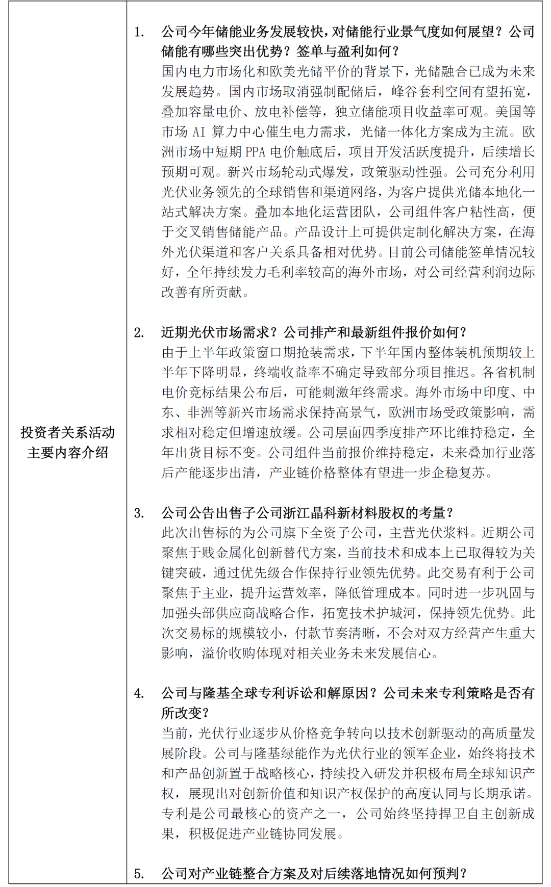 9月30日,晶科能源也发布了《晶科能源股份有限公司投资者关系活动记录表》,对储能业务、光伏业务、与隆基的专利诉讼等问题进行了回答。