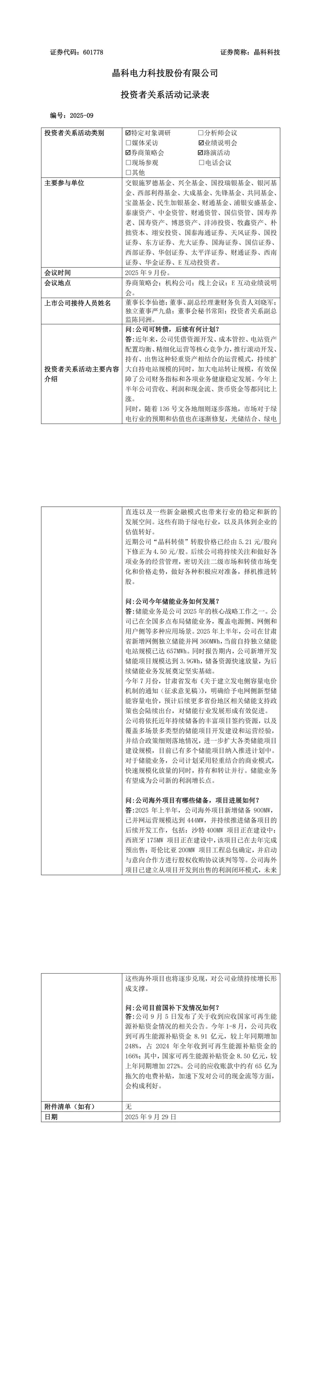 晶科科技的投资者关系活动记录表部分重点内容如下。