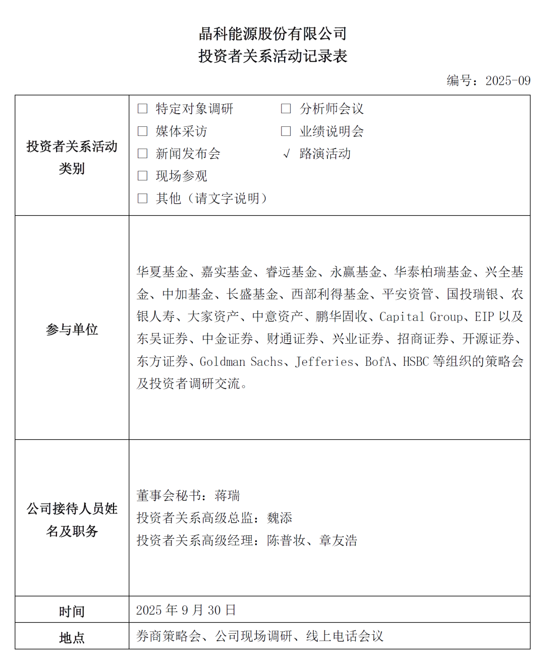 晶科能源投资者关系活动记录表部分重点内容如下。