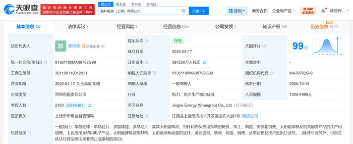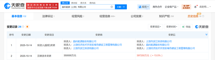 雷达财经讯,天眼查工商信息显示,近日,晶科能源(上饶)有限公司发生工商变更,注册资本由35亿人民币增至约39.7亿人民币,增幅13.5%。