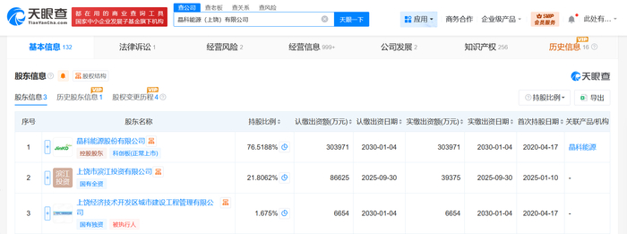 该公司成立于2020年4月,法定代表人为陈经纬,经营范围含单晶硅棒、单晶硅片、多晶铸锭、多晶硅片,高效太阳能电池、组件和光伏应用系统的研发、加工、制造、安装和销售,太阳能原料及相关配套产品的生产和销售等。股东信息显示,该公司由晶科能源(688223)、上饶市滨江投资有限公司、上饶经济技术开发区城市建设工程管理有限公司共同持股。