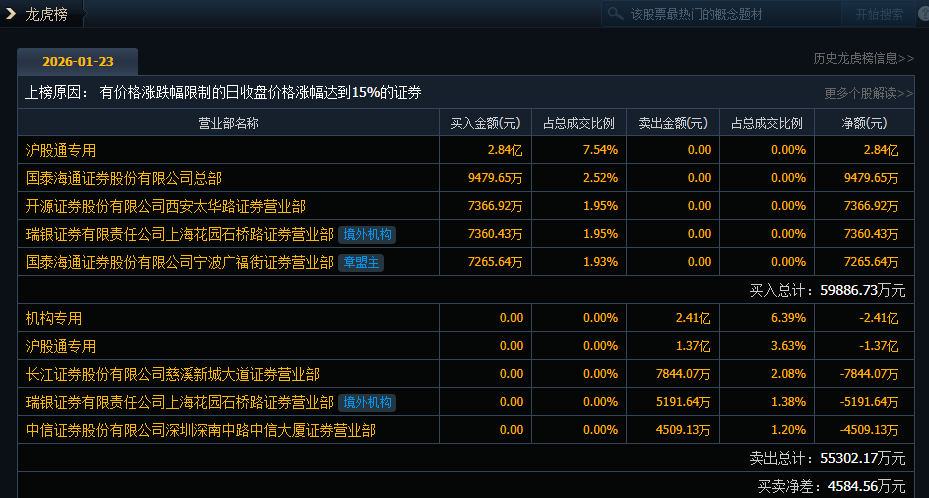 晶科能源今日20cm涨停,章盟主席位净买入7265.64万元