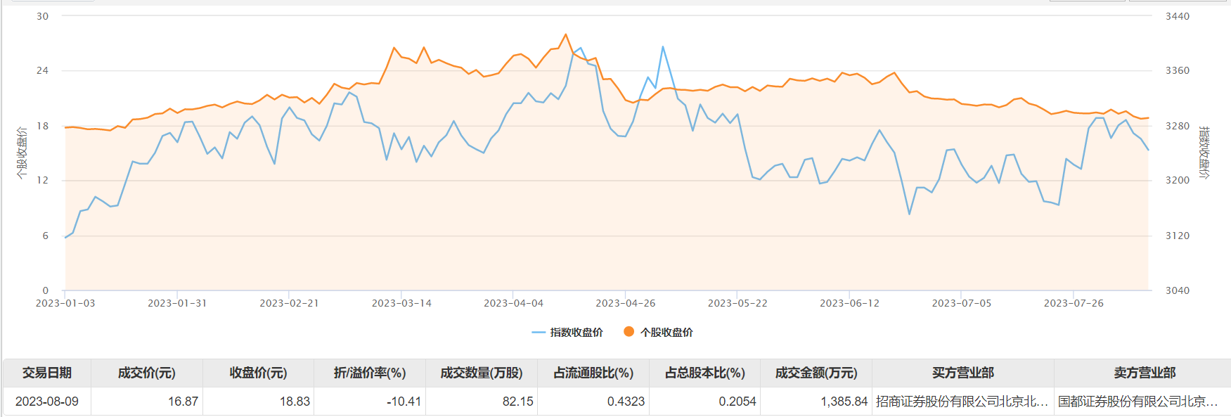 8月9日大宗交易成交82.15万股,成交额1385.84万元,占当日总成交额的28.03%,成交价16.87元,较市场收盘价18.83元折价10.41%。