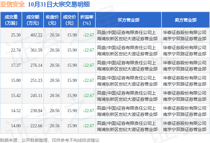 10月31日亚信安全现7笔折价22.67%的大宗交易 合计成交1989.89万元