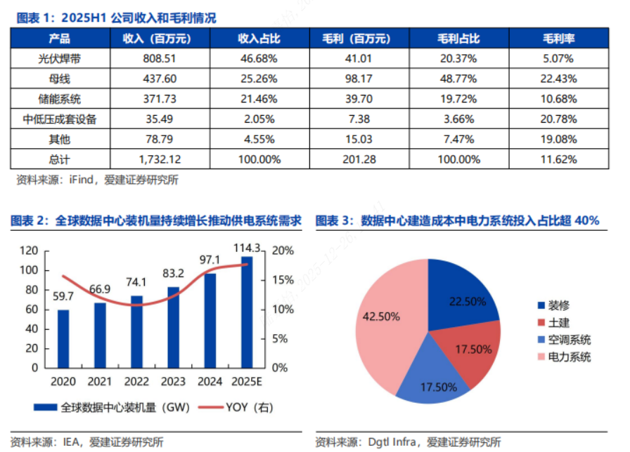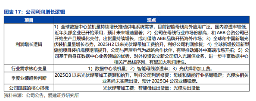 行业与公司情况:1)概况:公司主营配电设备(以母线为核心)、储能系统、光伏新材三大业务,积极拓展光模块业务,有望实现与现有业务协同效应推动公司持续发展,未来增长点主要在于数据中心母线需求旺盛、出海空间广阔,光伏焊带利润修复和光模块业务提供业绩增长弹性;2)母线:全球数据中心装机量持续增长推动供电系统需求,智能母线由于较高的空间利用率和较低的TCO成本逐渐成为数据中心机房末端配电的主流选择,公司在母线行业市场份额高,和ABB合资公司已开始生产且规模化交付,出货量持续增长,或可借助ABB品牌开拓海外市场;3)光伏焊带:全球和中国新增光伏装机量呈增长态势,光伏焊带是光伏组件里关键的导电连接部件,TOPCon双玻一体化成本焊带占比6%以上,2025H2以来光伏焊带加工费抬升,利好公司利润修复;4)储能:公司储能系统业务以网源侧和用户侧储能为主,全球新增投运新型储能项目装机规模逐渐提升,公司与西屋电气为战略合作伙伴,有望推动海外中高端市场开拓;5)光通信:公司基于自身在数据中心业务领域的优势,对外投资设立新公司切入光通信业务,进一步丰富数据中心相关产品线序列,有望加大利润弹性。