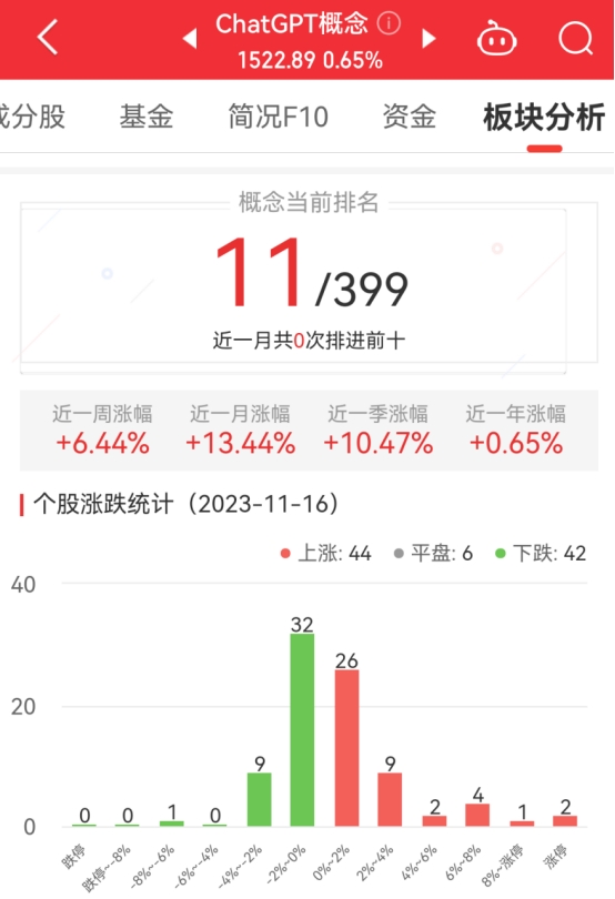中国经济网北京11月16日讯今日,ChatGPT概念板块整体涨幅0.65%,其中44只股票上涨,6只股票平盘,42只股票下跌。