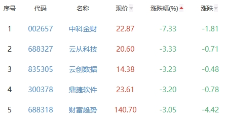 中科金财、云从科技、云创数据、鼎捷软件、财富趋势位列涨幅榜后五位,涨幅分别为-7.33%、-3.33%、-3.23%、-3.20%、-3.05%。