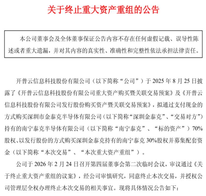 2月24日晚间,开普云(688228.SH)宣布,公司原本拟以现金收购南宁泰克70%股权、发行股份收购其30%股权的方式,购买深圳金泰克持有的南宁泰克100%股权,并募集配套资金。然而,由于市场环境发生变化,且交易双方在核心条款方面始终未能达成共识,开普云决定终止本次交易。