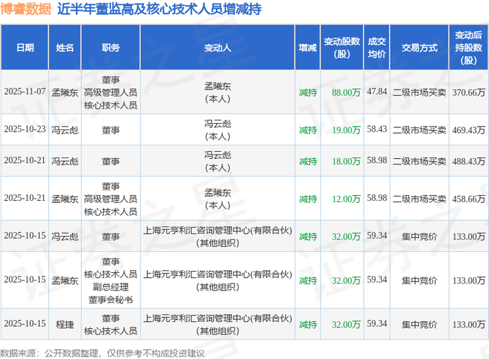 博睿数据近半年内的董监高及核心技术人员增减持详情如下: