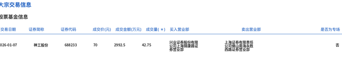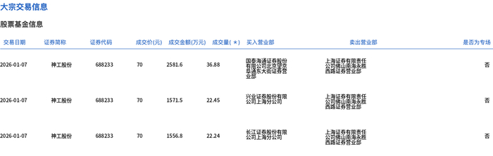 1月7日,神工股份大宗交易成交124.32万股,成交额8702.4万元,占当日总成交额的5.51%,成交价70元,较市场收盘价82元折价14.63%。