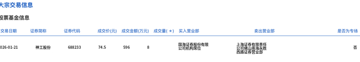 1月21日,神工股份大宗交易成交8万股,成交额596万元,占当日总成交额的0.63%,成交价74.5元,较市场收盘价87.09元折价14.46%。