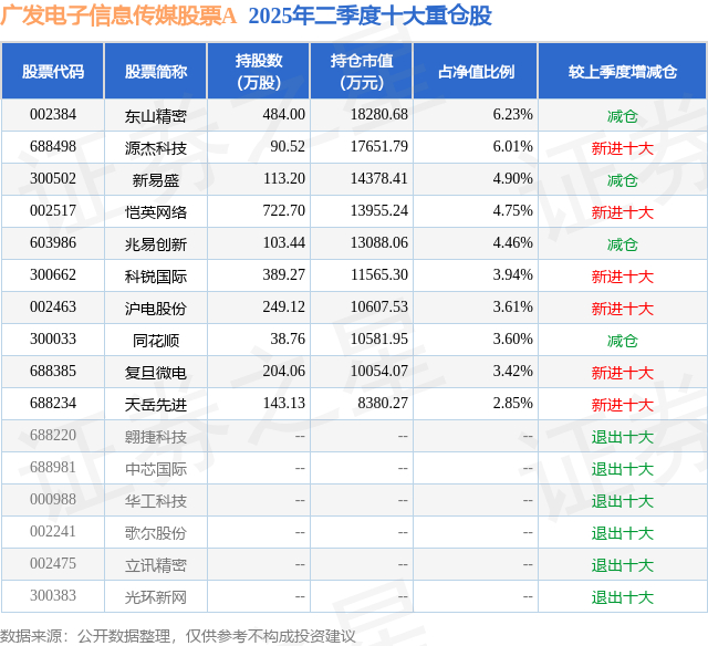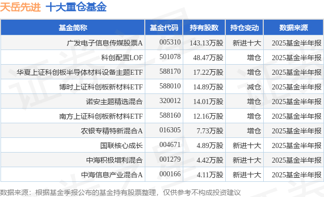 根据2025基金半年报公募基金重仓股数据,重仓该股的公募基金共13家,其中持有数量最多的公募基金为广发基金的广发电子信息传媒股票A。广发电子信息传媒股票A目前规模为9.19亿元,最新净值3.1478(9月26日),较上一交易日下跌3.34%,近一年上涨76.5%。该公募基金现任基金经理为冯骋。