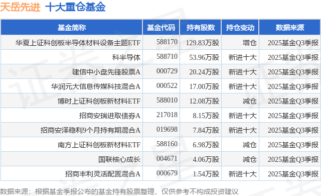根据2025基金Q3季报公募基金重仓股数据,重仓该股的公募基金共14家,其中持有数量最多的公募基金为华夏基金的华夏上证科创板半导体材料设备主题ETF。华夏上证科创板半导体材料设备主题ETF目前规模为27.9亿元,最新净值1.4176(11月19日),较上一交易日下跌1.01%。该公募基金现任基金经理为杨斯琪。杨斯琪在任的基金产品包括:华夏中证红利低波动ETF,管理时间为2024年6月11日至今,期间收益率为14.08%;华夏中证汽车零部件主题ETF,管理时间为2024年6月11日至今,期间收益率为44.71%;华夏中证红利低波动ETF发起式联接A,管理时间为2024年7月2日至今,期间收益率为13.97%;华夏中证全指运输ETF发起式联接A,管理时间为2024年11月7日至今,期间收益率为3.73%。