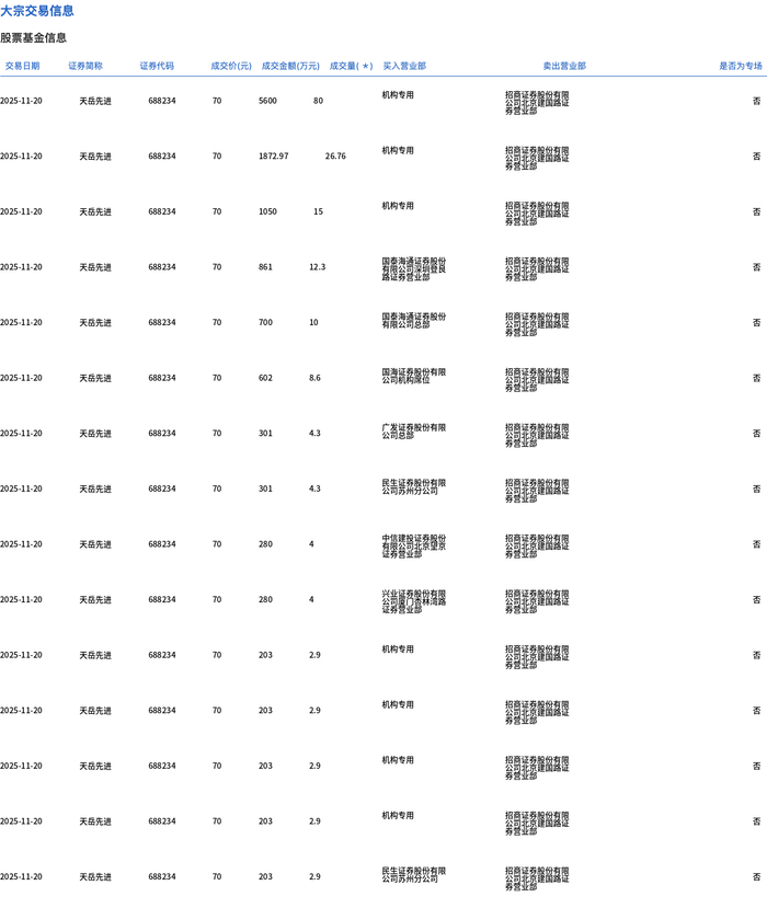 11月20日,天岳先进大宗交易成交183.76万股,成交额1.29亿元,占当日总成交额的9.39%,成交价70元,较市场收盘价79.98元折价12.48%。
