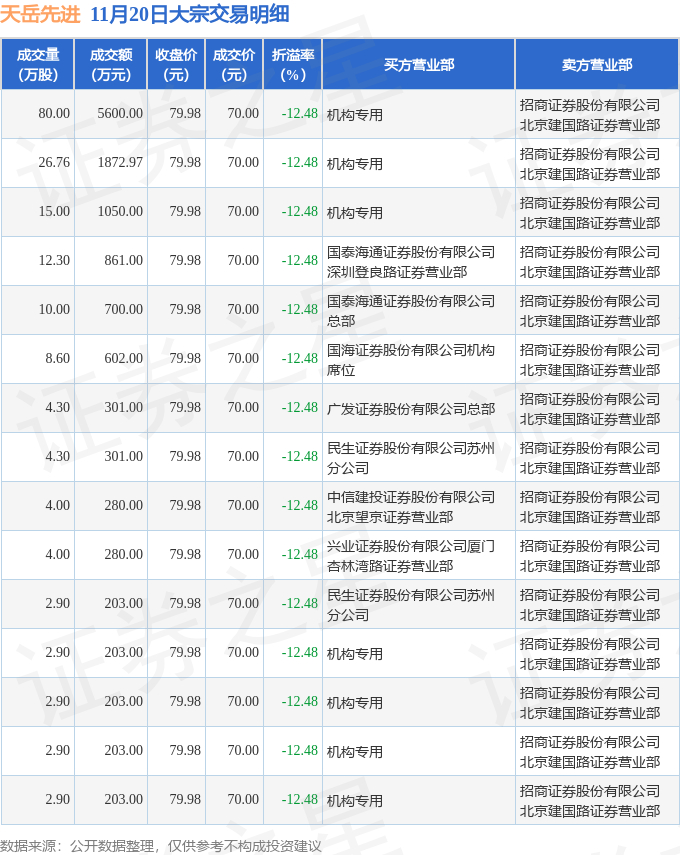 11月20日天岳先进现15笔折价12.48%的大宗交易 合计成交1.29亿元