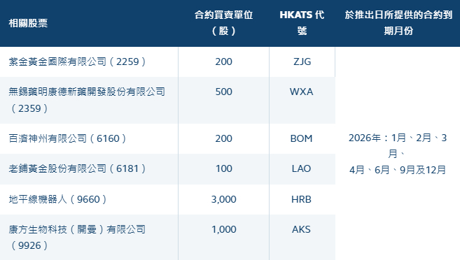 智通财经APP获悉,1月9日,香港交易所宣布,将于2026年1月19日(星期一)推出六只新的股票期权类别,进一步拓展股票期权市场及为投资者提供更丰富的选择。相关股票包括紫金黄金国际(02259)、药明康德(02359)、百济神州(06160)、老铺黄金(06181)、地平线机器人(09660)及康方生物(09926)。