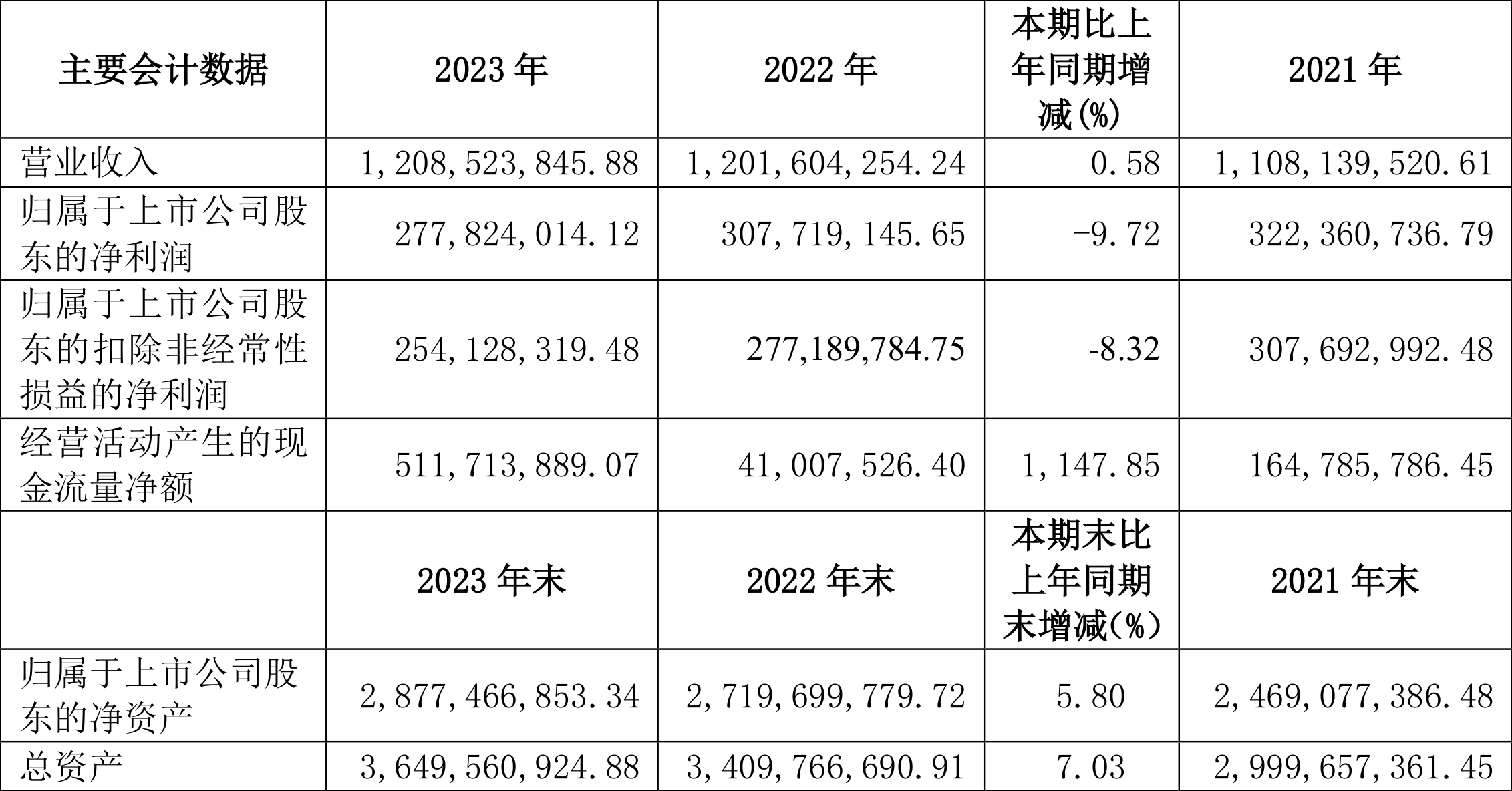 2023年,公司经营活动现金流净额为5.12亿元,同比增长1147.85%;筹资活动现金流净额-1.21亿元,同比减少6229.84万元;投资活动现金流净额-8155.62万元,上年同期为-7.63亿元。