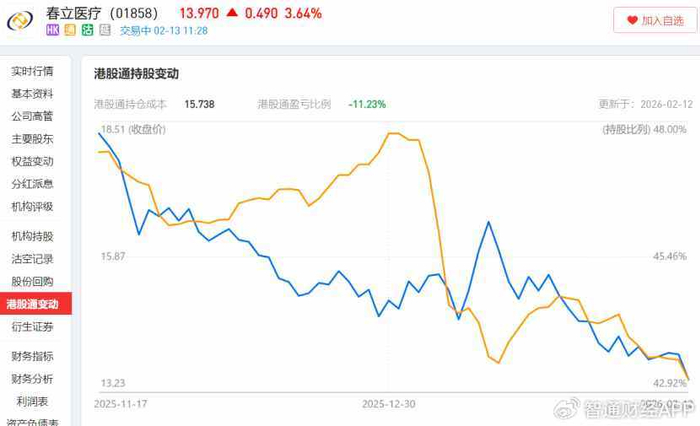 但到了2026年开年,随着春立医疗的一波股价回弹,港股通资金持股比例突然出现大跳水。今年1月16日,其持股比例跌至43.47%,半个月内港股通持股比例下跌超4个百分点。虽然后续在春立医疗股价技术性下跌时,该比例存在一波回升,但今年2月以来,港股通资金在春立医疗上展现出的投资策略更偏向看趋势操作的右侧交易。此时其持股比例已跌至43.16%,并且以持仓成本计算,港股通资金已亏损超10%。