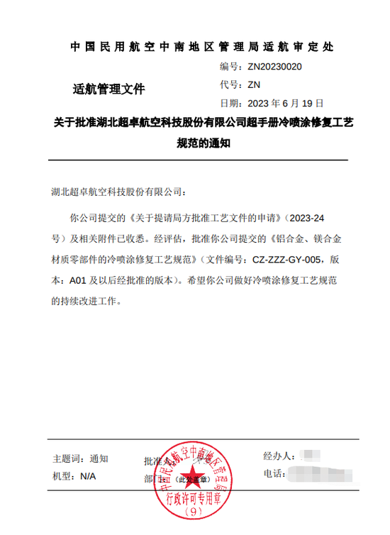 近日,湖北超卓航空科技股份有限公司向中国民用航空中南地区管理局适航审定处提交的《铝合金、镁合金材质零部件的冷喷涂修复工艺规程》正式获得批准。这标志着冷喷涂固态增材制造技术进军国内民航维修的道路正式打开,也宣告着超卓航科将在局方授权的范围内,拥有代表局方对民用航空产品和零部件使用冷喷涂固态增材制造技术进行超规范修理的技术和能力。