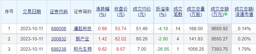 上证报中国证券网讯 据东方财富Choice数据,10月11日,A股共65只个股发生大宗交易,总成交12.2亿元,其中澜起科技、新产业、和元生物成交额居前,成交额依次为8650.92万元、8550.27万元、7393.75万元。