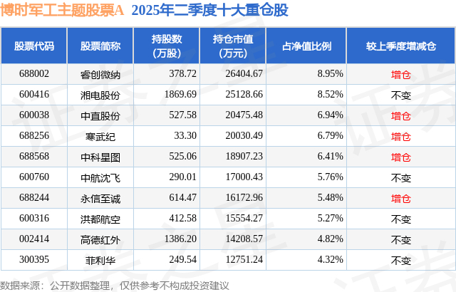 根据2025基金半年报公募基金重仓股数据,重仓该股的公募基金共2家,其中持有数量最多的公募基金为博时基金的博时军工主题股票A。博时军工主题股票A目前规模为25.25亿元,最新净值1.94(9月25日),较上一交易日下跌1.27%,近一年上涨75.09%。该公募基金现任基金经理为曾鹏。曾鹏在任的基金产品包括:博时新兴成长混合,管理时间为2013年1月18日至今,期间收益率为216.5%;博时特许价值混合A,管理时间为2018年6月21日至今,期间收益率为276.17%;博时沪港深优质企业基金A,管理时间为2021年1月20日至今,期间收益率为-3.58%;
