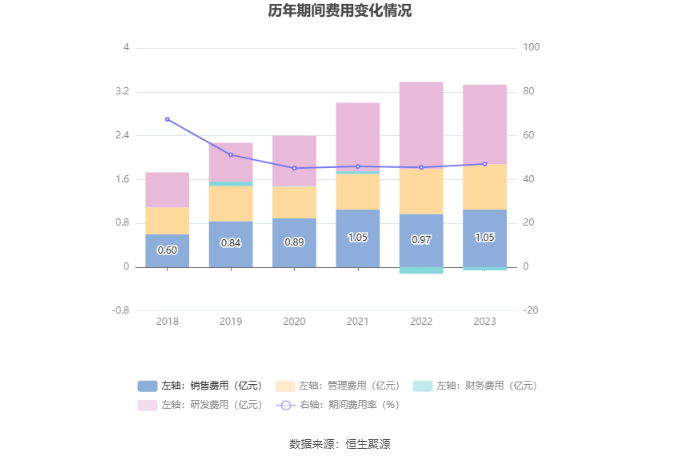 2023年,公司期间费用为3.27亿元,较上年同期增加64.88万元;期间费用率为47.04%,较上年同期上升1.52个百分点。其中,销售费用同比增长8.03%,管理费用同比增长1.23%,研发费用同比下降8.73%,财务费用由去年同期的-1200.96万元变为-632.68万元。