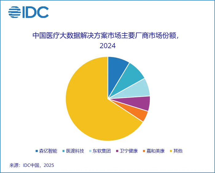 近日,IDC 发布的《2024 年中国医疗大数据市场份额报告》显示:2024 年,医疗大数据解决方案市场规模呈现小幅增长,达 36 亿元人民币;厂商收入增速放缓,但头部厂商维持了较高的市场份额。