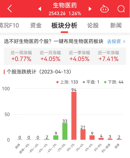 中国经济网北京4月13日讯今日,生物医药板块整体涨幅1.26%,其中133只股票上涨,1只股票平盘,44只股票下跌。