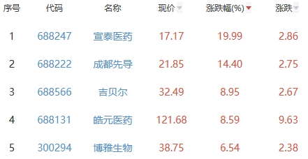 其中,宣泰医药、成都先导、吉贝尔、皓元医药、博雅生物位列板块涨幅前五位,涨幅分别为19.99%、14.40%、8.95%、8.59%、6.54%。