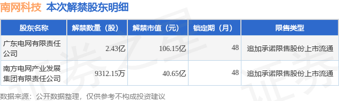 证券之星消息,根据市场公开信息整理,南网科技(688248)于12月23日将有3.36亿股限售股份解禁,为公司追加承诺限售股份上市流通,占公司总股本59.55%。(本次数据根据历史公告整理得出,实际情况以上市公司最新公告为准)本次解禁后,公司已无限售股份。具体如下图所示: